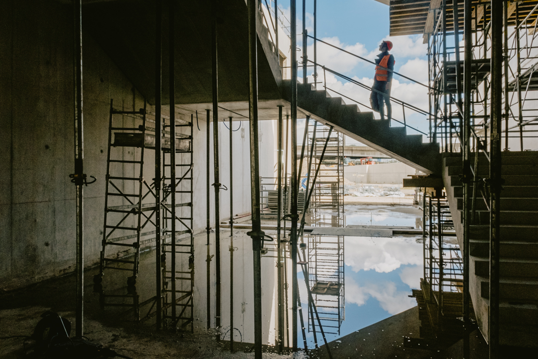 Des travaux de terrassement à l’élévation des murs, en passant par les poses spectaculaires des gradins en béton des amphithéâtres et de la méga-poutre en acier, il aura fallu environ un an et demi pour que le bâtiment sorte de terre et atteigne son niveau final (cinq étages et un niveau en sous-sol).